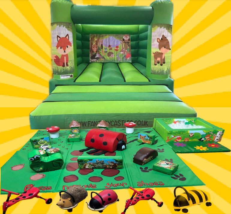Our super cute Woodland themed castle, matching 4ft foam ball pool, 21 piece soft play set and 5 ride ons. A fabulous generic theme suitable for boys and girls parties.