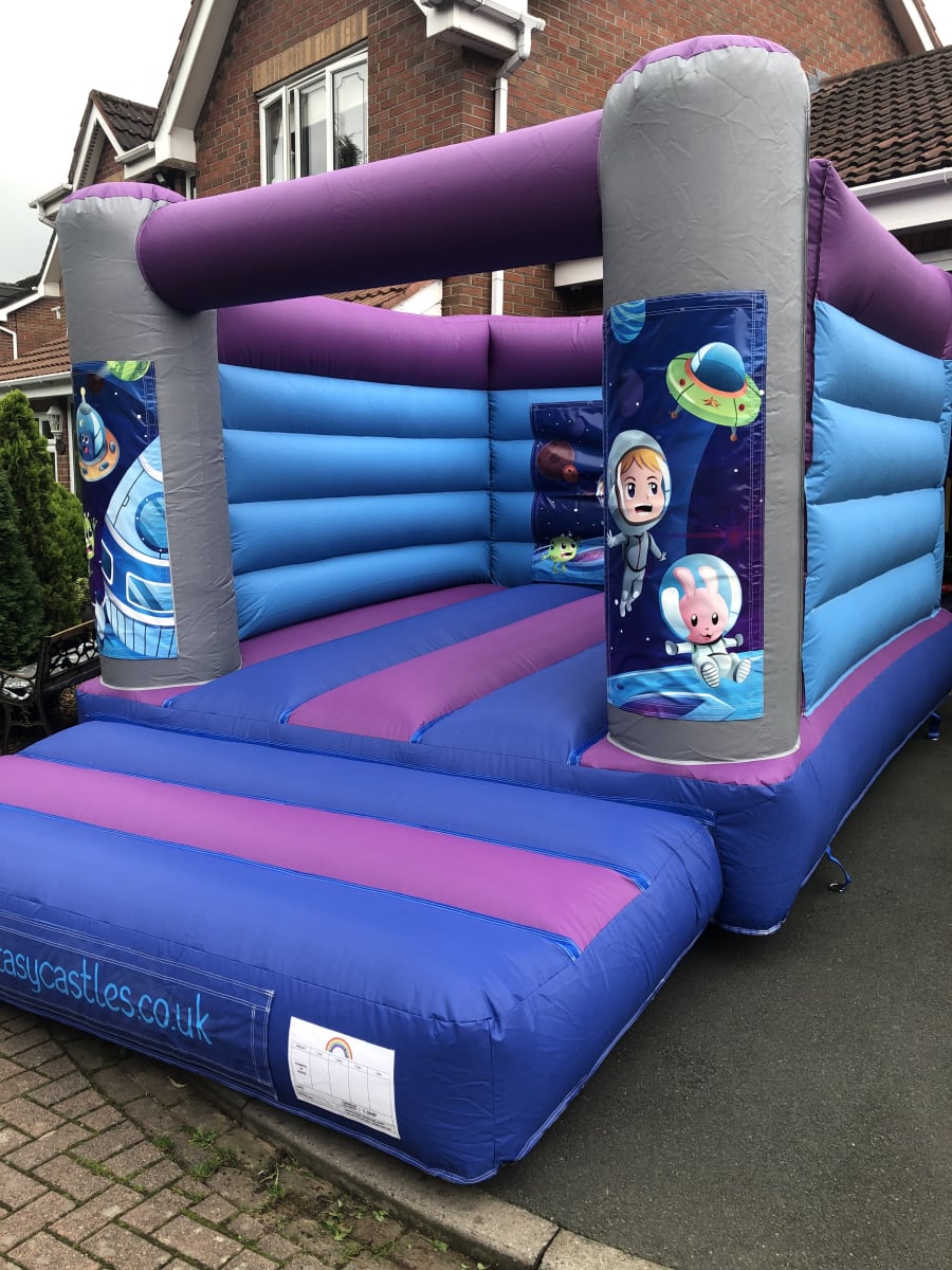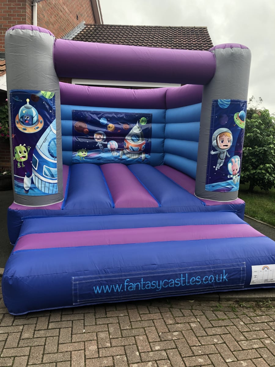 A great sized castle to keep the children entertained and low height so will fit in most indoor venues. A top quality castle in blues, silver and purples featuring Space artwork. 15ft x 12ft x 9.5ft high