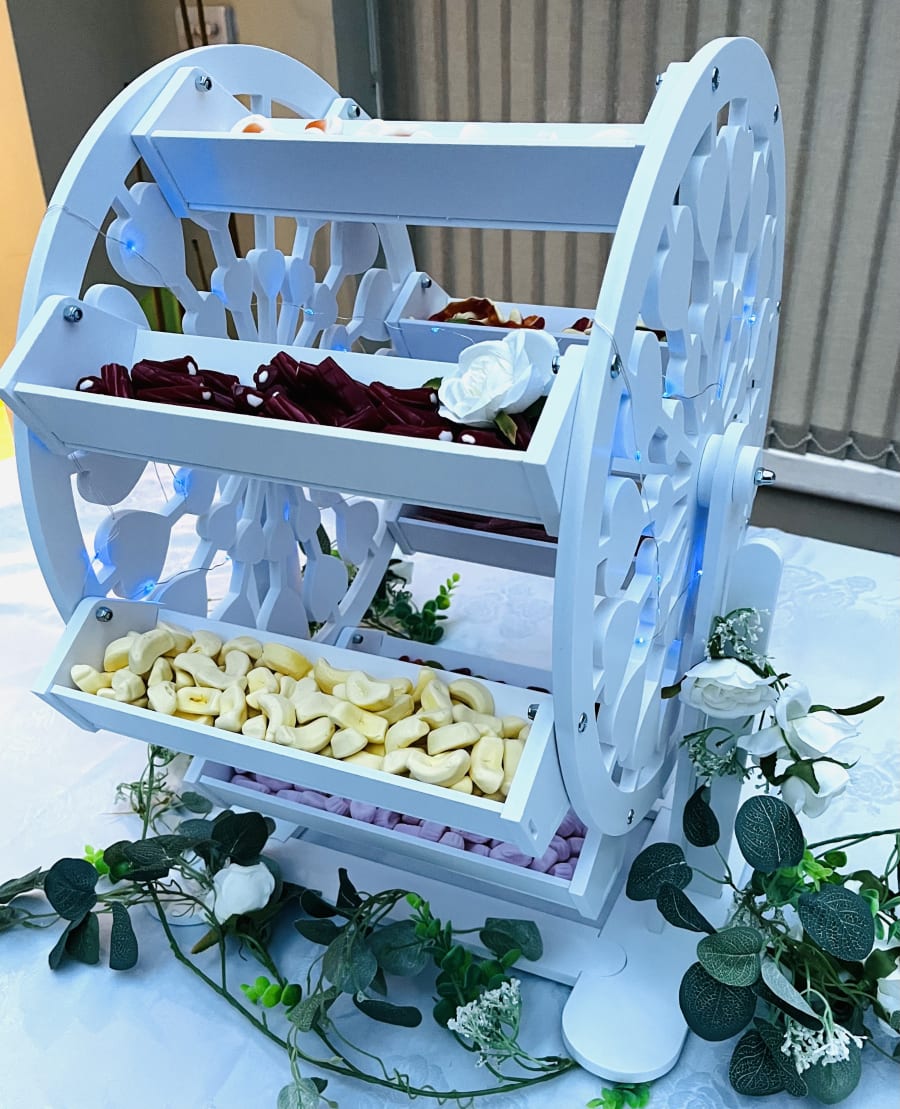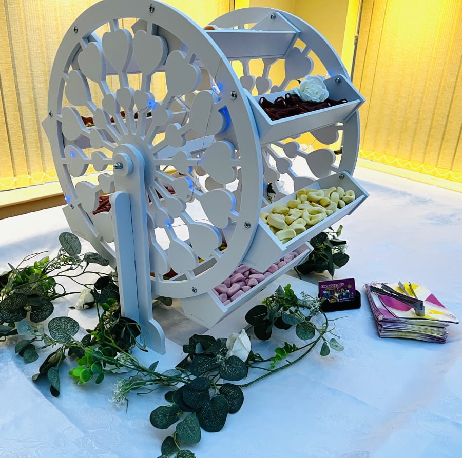 Imagine the joy on your guests' faces as they indulge in a delightful array of pick n mix sweets, elegantly presented on our Ferris wheel. If required, we can also provide a white, black or silver table cloth, LED light box with a personalised message, and artificial flowers to enhance the ambiance of your event.