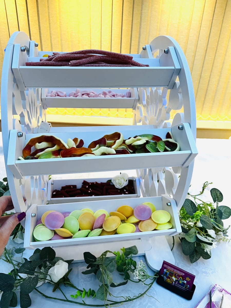 Simply provide a table for the ferris wheel to sit on, and watch as it becomes the focal point of your party, wedding, or special occasion. Let us take care of the sweet treats while you create unforgettable memories with your loved ones. paper bags and tongs are provided. We can also provide table coverings, led light box and flower decor.