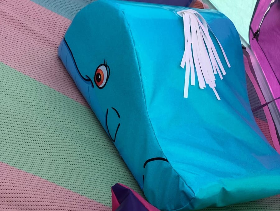 Glittery aqua coloured with a sensory white tassel coming from the top like he’s spraying water