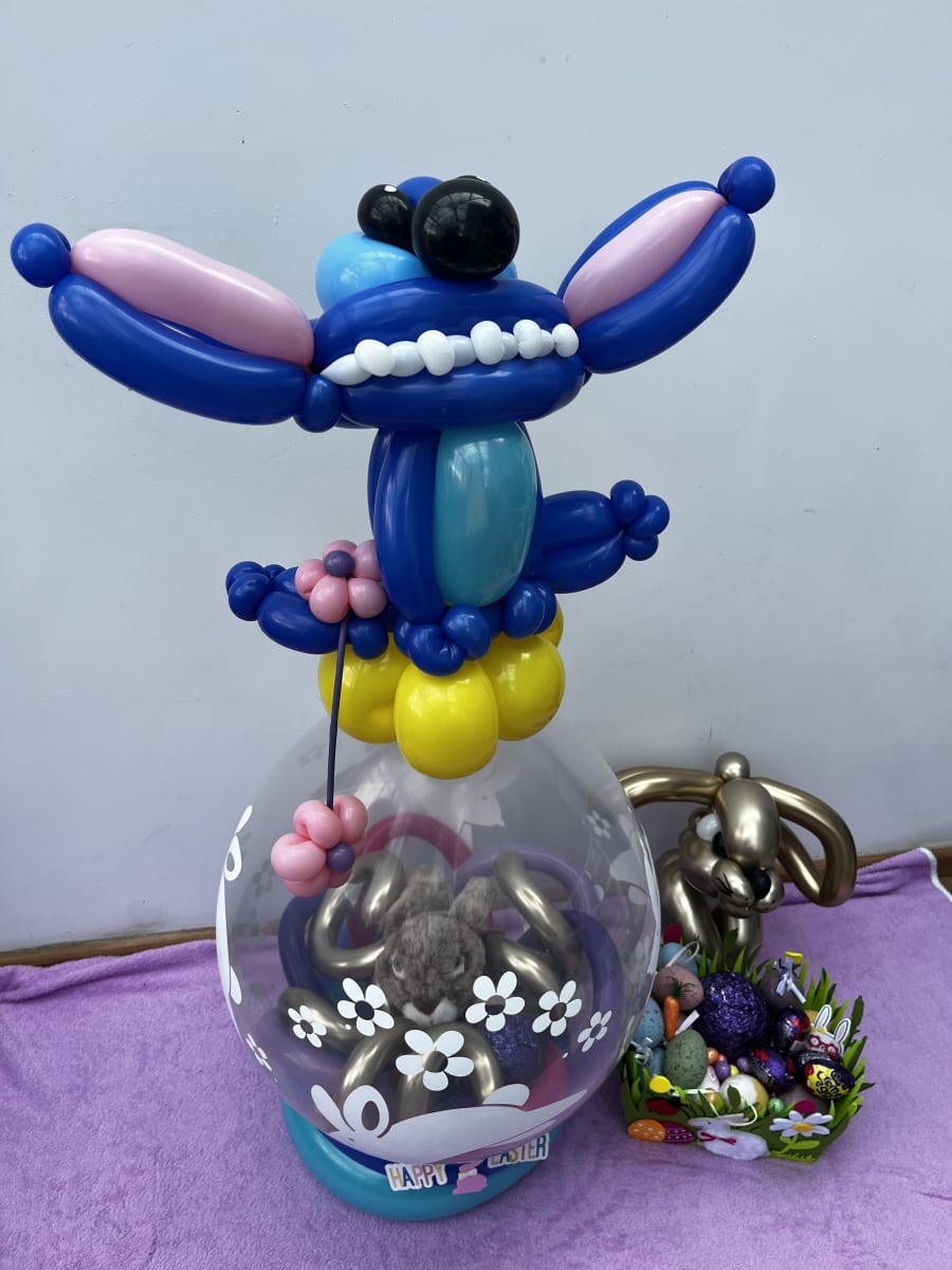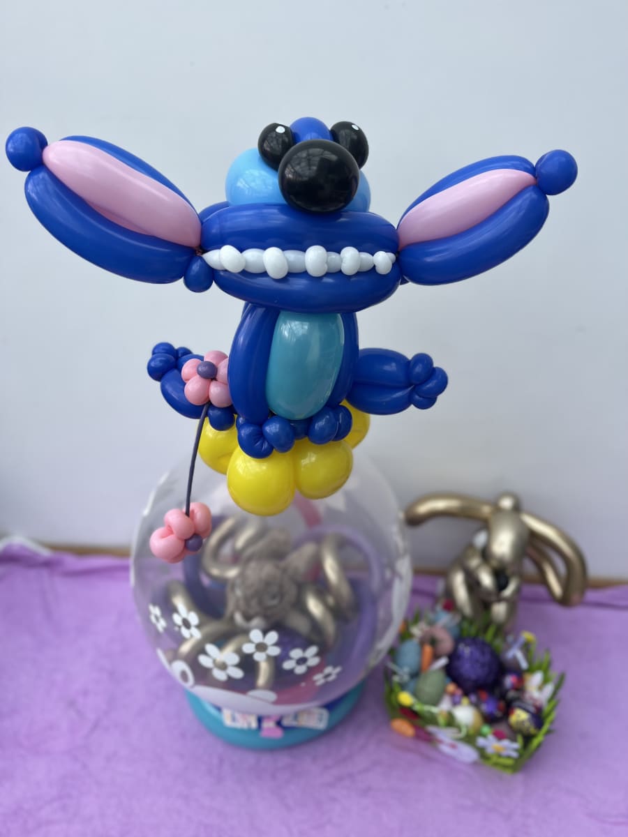 Introducing the Stitch Popping Balloon, a delightful hand-twisted balloon sculpture featuring everyone's favourite mischievous character, Stitch. This unique creation sits atop a large popping balloon filled with vibrant balloons and, for an extra special touch we can also add a teddy of your own.