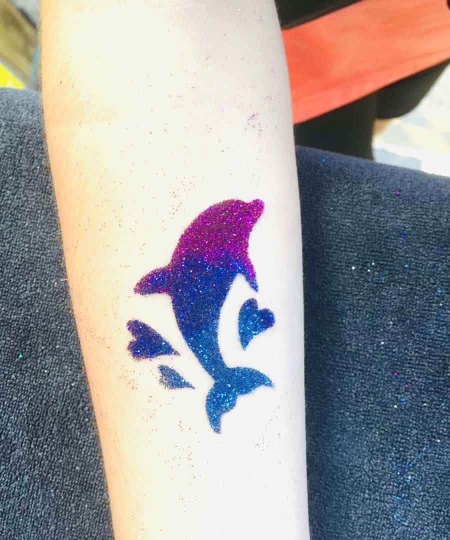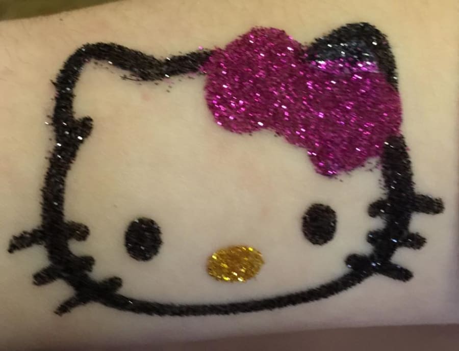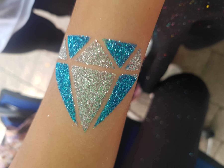 Tattoos are applied to the body only, legs or arms usually, with a latex free, prosthetic adhesive and FDA approved, cosmetic glitters, powders and inks. We operate strict hygiene practices including disinfecting skin before application and single use tattoo stencils.