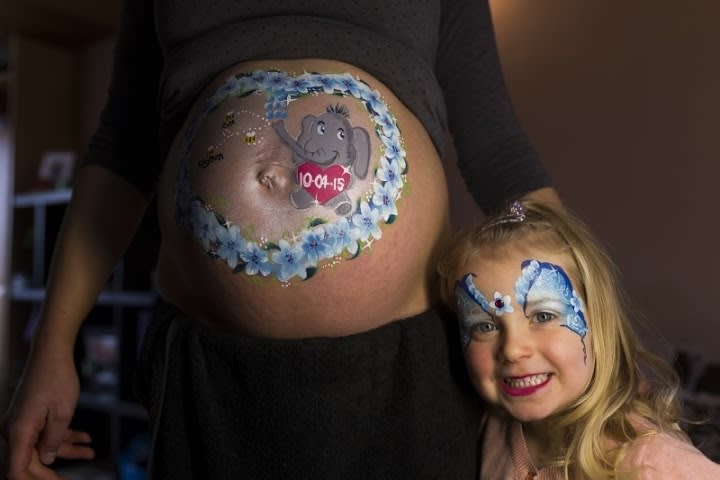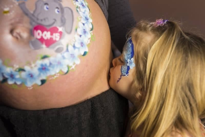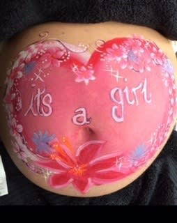Having your bump painted is a great way of remembering this special time and makes a brilliant keepsake for after your baby is born. They are also a fun way of announcing your pregnancy. Or if you are thinking of buying a package as a present, gift vouchers are available - perfect for baby showers. Having had two pregnancies myself, I will do my utmost to make you feel as relaxed and at ease as possible This is a bespoke service with a design created just for you. Don't worry If you don't have a design in mind, I'm happy to make suggestions. It is a pleasant experience done in the comfort of your own home. Have your partner, family or friends present if you wish. You can sit, lie or stand - however you feel comfortable and can take as many breaks or position changes as you like. You dont need to remove any clothing, just roll up your top and towels are placed inside your clothing to protect them. Stretch marks ? Not a problem, they can be covered up with the paints.