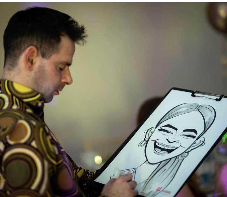 Each guest will receive a free black & white caricature with grey shading, drawn on high-quality A3 paper and protected in a convenient A3 bag. Neil is mobile and can effortlessly mingle with guests, ensuring everyone gets their own personalised caricature without any setup required.