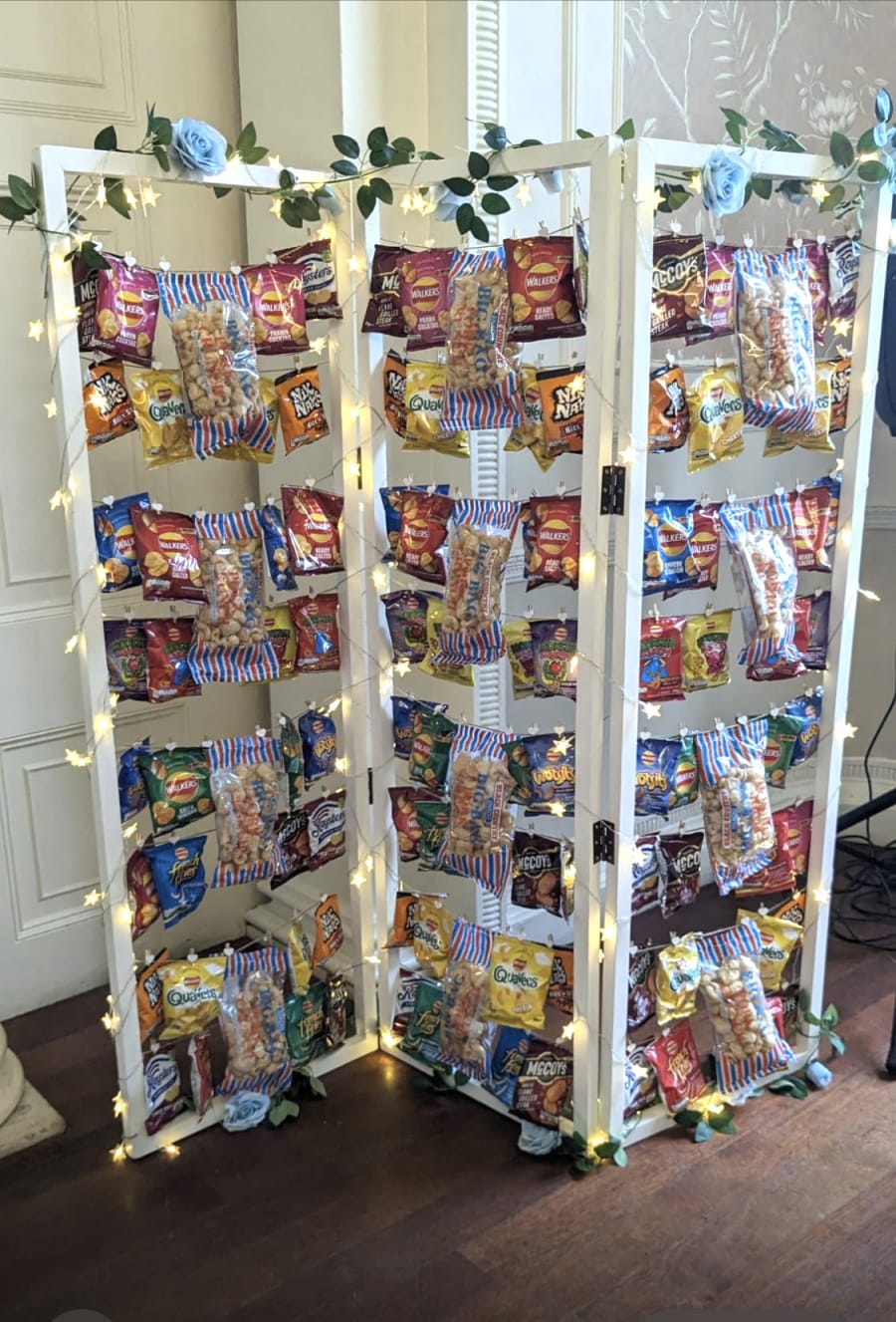 Our Crisp Wall is perfect for all ages and has space for 144 packets of crisps or sweets. We also provide fairy lights too.