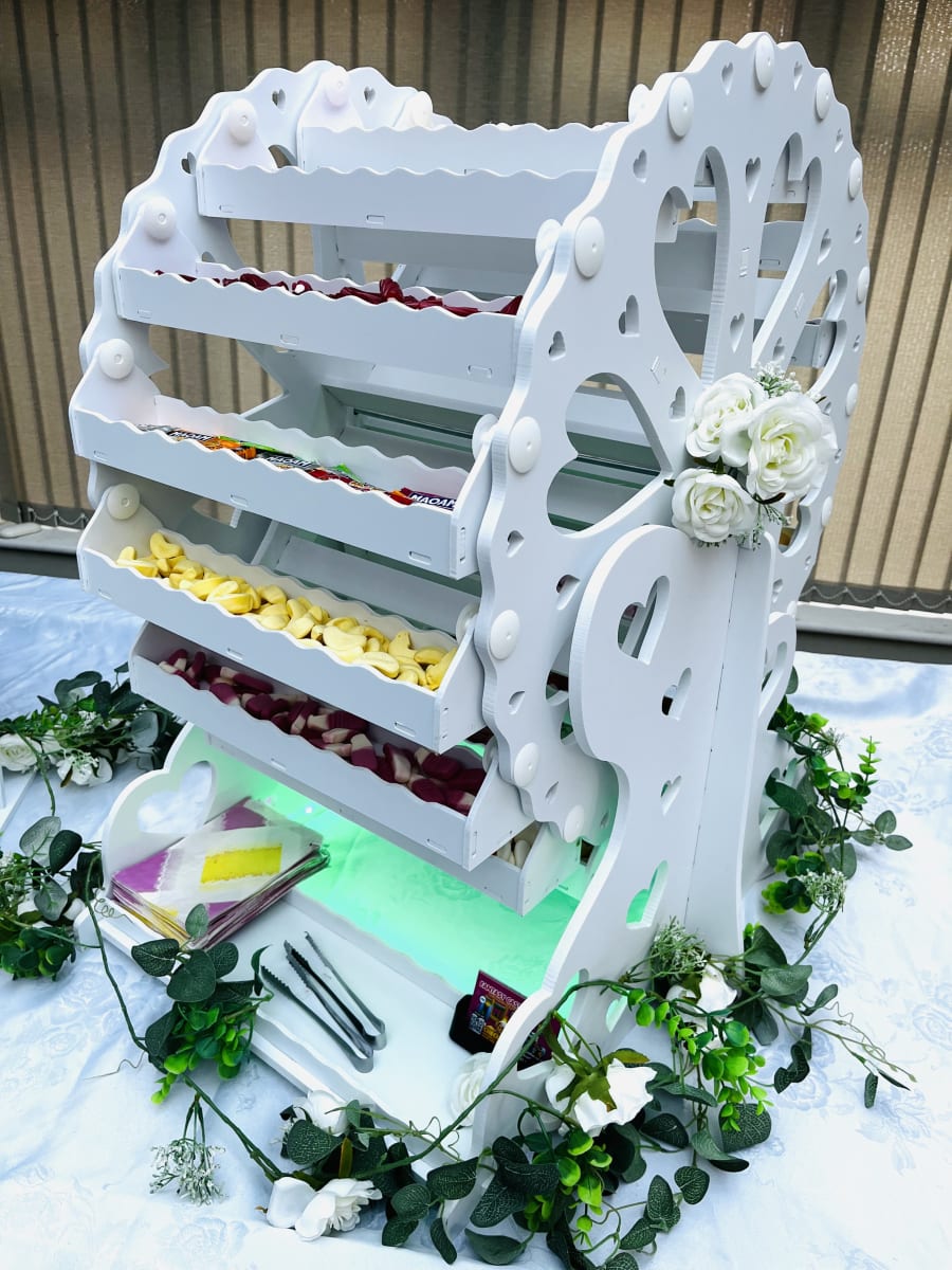 Our stunning white 1-metre-high Sweets Ferris Wheel is the perfect centerpiece for any special occasion in Telford, Newport, Eccleshall, Gnosall, Albrighton, Market Drayton, Wem, Shawbury, Shrewsbury, Bridgnorth, Shifnal, Broseley, Much Wenlock, and surrounding areas. đ