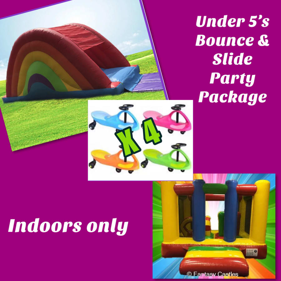 Our bright and colourful, generic rainbow slide is one of only two in the UK. Teamed up with 4 of our self propelled 'wiggle' cars with light up wheels, and our super popular Biff Bash bouncy castle. The Bouncy castle has obstacles inside for your child to climb through and under. With is netted sides it means you can see your children at all times as well.