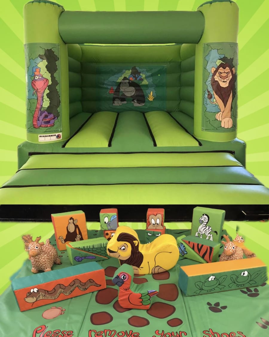 Our Jungle themed 15ft x 11ft x 9ft high bouncy castle, 14 piece, hand painted jungle soft play and 2 giraffe hoppers.
