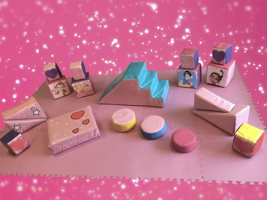 Our 15ft x 12ft x 9ft Princess themed castle with all your favourite characters plus our 19 piece themed soft play set to match. Our soft play set also contains glitter soft play items
